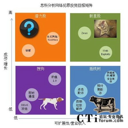 思科網(wǎng)絡(luò)犯罪投資回報(bào)(CROI)矩陣:今年的《年度安全報(bào)告》首次推出了思科CROI矩陣,以波士頓咨詢集團(tuán)著名的“增長-份額矩陣”為基礎(chǔ)。CROI分析了2010年何種類型的網(wǎng)絡(luò)犯罪將為成為“成功者”以及“失敗者”。該矩陣根據(jù)2009年的表現(xiàn),預(yù)測大量的銀行業(yè)Trojan