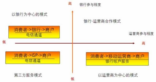 從產(chǎn)業(yè)鏈環(huán)節(jié)上看,移動(dòng)支付的主要參與者主要包括:消費(fèi)者、平臺(tái)提供商、銀行、運(yùn)營(yíng)商和商戶。其中,銀行和運(yùn)營(yíng)商在其中具有較高的談判能力。因此,可以按照這兩者在產(chǎn)業(yè)鏈中的參與程度,劃分移動(dòng)支付的商業(yè)模式。總的來(lái)說(shuō),銀行機(jī)構(gòu)管理著廣大用戶的資金帳戶,擁有完善的支付體系,在支付領(lǐng)域具有天然的用戶信任。運(yùn)營(yíng)商則擁有完備的網(wǎng)絡(luò)設(shè)施和先進(jìn)的IT系統(tǒng),通過(guò)定制終端,運(yùn)營(yíng)商可以將各種先進(jìn)的移動(dòng)應(yīng)用提供給用戶,使用戶獲得良好的移動(dòng)化生活體驗(yàn)。因此,運(yùn)營(yíng)商在這方面具有較好的用戶資源和營(yíng)銷渠道。