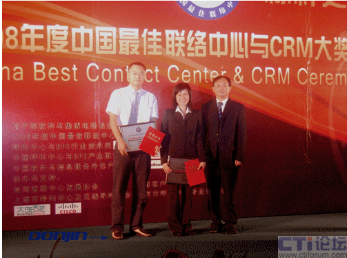 “2008中國最佳聯(lián)絡(luò)中心及CRM評獎”是由中國唯一的國家級呼叫中心與BPO行業(yè)協(xié)會--中國呼叫中心與BPO產(chǎn)業(yè)聯(lián)盟(CNCBA) 與呼叫中心與BPO行業(yè)資訊網(wǎng)(51 Callcenter)、中國軟件與服務(wù)外包產(chǎn)業(yè)聯(lián)盟共同主辦,代表中國唯一接軌全球最佳聯(lián)絡(luò)中心評選標準,是工業(yè)和信息化部唯一認可的行業(yè)獎項,為真正意義上的中國聯(lián)絡(luò)中心“奧斯卡”獎。參選對象為中國行政區(qū)域內(nèi)的各類政府、企事業(yè)單位聯(lián)絡(luò)中心、客戶服務(wù)中心、客戶支持中心、客戶聯(lián)絡(luò)中心、以及同類含義的職能部門及其從業(yè)人員等。因此,無論是從獎項的規(guī)格還是入選的圍度都是非常高規(guī)格與嚴格的。東進技術(shù)的多媒體呼叫中心系統(tǒng)平臺解決方案在此次評選中經(jīng)過了用戶、業(yè)界同仁與專家學者的一致認可,最終獲得了這一殊榮。