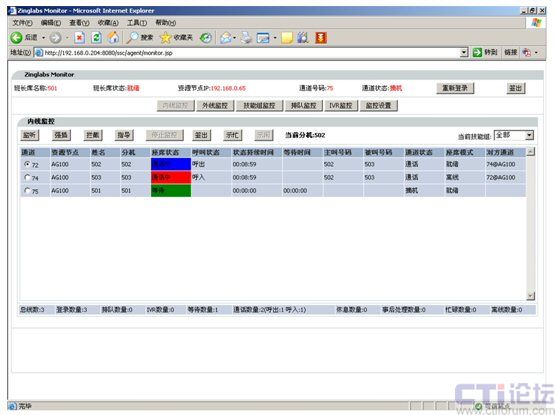 3.模塊界面劃分清晰:Monitor監(jiān)控模塊分為內(nèi)線監(jiān)控、外線監(jiān)控、虛通道監(jiān)控、技能組監(jiān)控和IVR監(jiān)控共五大類。各類別功能獨立運行,可根據(jù)企業(yè)對聯(lián)絡中心班長的職責劃分,對各類技能組、項目組的班長登錄提供有區(qū)別的監(jiān)控頁面,從而為每位班長的恪盡職守提供了良好的保證。