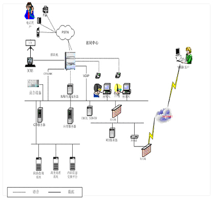 2 ) CTI(計(jì)算機(jī)電話集成)服務(wù)器:通過該平臺(tái)實(shí)現(xiàn)計(jì)算機(jī)網(wǎng)絡(luò)與電話系統(tǒng)的無縫結(jié)合,可通過計(jì)算機(jī)應(yīng)用系統(tǒng)對話務(wù)處理進(jìn)行操作;
