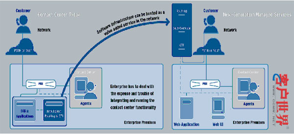 對(duì)于IVR托管的做法可以采用VXML的開放架構(gòu),這樣就可以提供很多的呼叫中心來共用整個(gè)運(yùn)營(yíng)商所建IVR資源。甚至這個(gè)開放的架構(gòu)可以結(jié)合語音辨識(shí)與文本轉(zhuǎn)語音的功能,開放給許多的應(yīng)用開發(fā)商來開展其業(yè)務(wù),這樣的發(fā)展可能會(huì)超過單純呼叫中心IVR的托管。