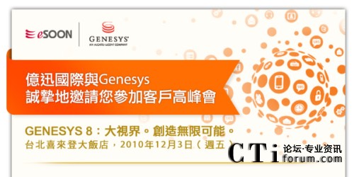 持續(xù)優(yōu)化企業(yè)績(jī)效及培養(yǎng)意見(jiàn)領(lǐng)袖,都是協(xié)助我們?cè)谂_(tái)灣的用戶與其客戶有更佳交流往來(lái)的重要作法,因此,我們特別籌辦了‘客戶高峰會(huì)’,全面邀集來(lái)自Genesys新加坡、香港及中國(guó)的專(zhuān)家和同儕與您面對(duì)面,進(jìn)行互動(dòng)的知識(shí)分享與意見(jiàn)交換。