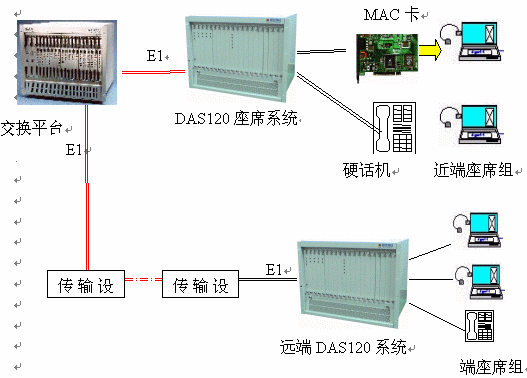 DAS120交換平臺采用1-4個E1連接,可以簡潔實現(xiàn)PCM信號轉(zhuǎn)模擬信號引出到座席。E1接口的信令可選配為隨路信令CAS和透明通道Clear Channel。E1可通過光端機(jī)、微波、HDSL等設(shè)備來傳輸,從而實現(xiàn)分布式組網(wǎng)。