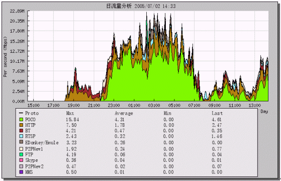 - 監(jiān)控時(shí)間段內(nèi),POCO流量占62.01%,HTTP占21.16%,RTSP(在線視頻)占5.1%,P2P業(yè)務(wù)(包括EDonkey、P2PNE、BT等)占10.53%,F(xiàn)TP為0.61%,其他業(yè)務(wù)不到0.59%。如下圖: