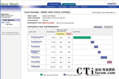 電話交易監(jiān)測: 一個電話交易由一條指定的路由組成,呼叫者穿越這條路由,通過按鍵或語音完成一項自助服務(wù)的交易。對于每一個通話路由,Voice Watch被設(shè)計成通過撥號或者語音指定這條路由完成一項IVR自助服務(wù)的交易,例如賬戶余額檢查,賬單支付等。電話交易監(jiān)測管理自助服務(wù)的可用性和性能,也測量承載網(wǎng)的性能和交換機、IVR、語音識別和主機/數(shù)據(jù)庫的響應(yīng)時間。