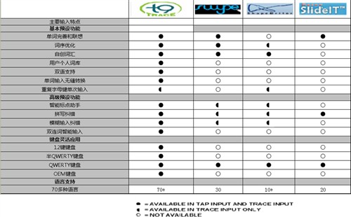 圖:Nuance T9 Trace與同類(lèi)型輸入法功能對(duì)比表