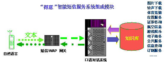 "得意"智能短信系統(tǒng)是在現(xiàn)有的數(shù)據(jù)通信和短信服務的技術平臺上,加入基于中文語言理解技術的"得意"口語對話系統(tǒng),從而能夠讓用戶在手機上以自然語言的形式享受指定領域的智能短信服務。智能短信系統(tǒng)對短信文本進行自動分析和理解,再從知識庫中提取用戶所需的信息,然后自動產(chǎn)生智能應答語句,并以短信文本的形式發(fā)回用戶。由于"得意"口語對話系統(tǒng)具有上下文相關理解和人機混合主導等強大功能,在規(guī)定的領域內(nèi),用戶可通過一個或者多個短信構(gòu)成一組對話,完成復雜的信息查詢或者其他互動服務。