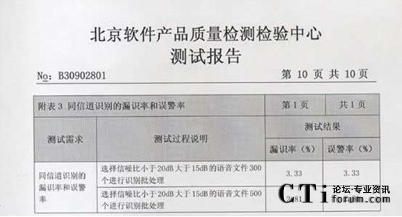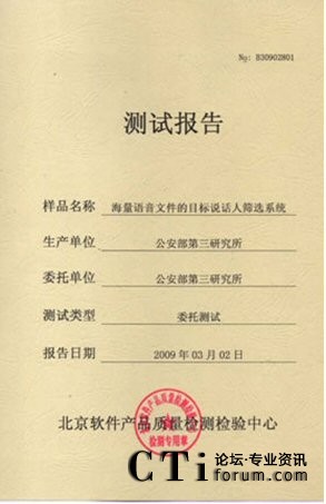 CTI論壇(ctiforum)06月25日消息: 2009年3月02-10日:北京軟件產(chǎn)品質(zhì)量檢測(cè)檢驗(yàn)中心對(duì)《海量語(yǔ)音文件的目標(biāo)說(shuō)話(huà)人篩選系統(tǒng)》進(jìn)行了全面測(cè)試包括用戶(hù)文檔、功能性、可靠性、易用性、可維護(hù)性等多個(gè)特性。測(cè)試結(jié)果表明《海量語(yǔ)音文件的目標(biāo)說(shuō)話(huà) 2009年3月02-10日,北京軟件產(chǎn)品質(zhì)量檢測(cè)檢驗(yàn)中心對(duì)《海量語(yǔ)音文件的目標(biāo)說(shuō)話(huà)人篩選系統(tǒng)》進(jìn)行了全面人篩選系統(tǒng)》滿(mǎn)足軟件相關(guān)國(guó)家標(biāo)準(zhǔn)中的要求,系統(tǒng)在模擬測(cè)試環(huán)境中運(yùn)行正常、穩(wěn)定,正式通過(guò)北京軟件產(chǎn)品質(zhì)量檢測(cè)檢驗(yàn)中心的嚴(yán)格測(cè)試,系統(tǒng)的漏識(shí)率和誤警率分別達(dá)到了2.81%和 2.81%。