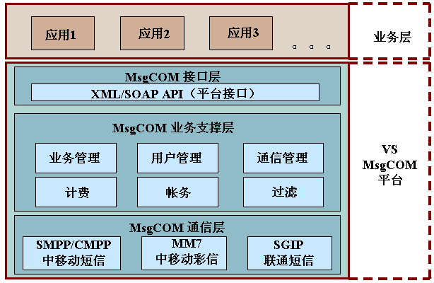 上海聲軟公司(www.voicesoft.com.cn)的MsgCOM通信平臺在國內(nèi)創(chuàng)造性地將業(yè)務(wù)和平臺分開,利用先進(jìn)的XML/SOAP技術(shù)進(jìn)行二次開發(fā)定制業(yè)務(wù)應(yīng)用,以下是它的系統(tǒng)邏輯結(jié)構(gòu)圖: