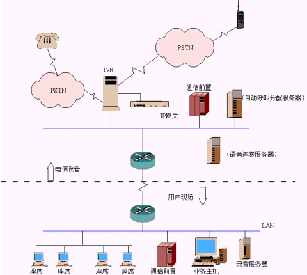 根據(jù)目前連鎖零售服務(wù)企業(yè)的業(yè)務(wù)模式,現(xiàn)提供一個(gè)由IVR自動(dòng)語音應(yīng)答系統(tǒng)和以IP網(wǎng)絡(luò)為基礎(chǔ),以純軟方式交換的呼叫中心相結(jié)合的整體解決方案。即由吉亞公司在北京通信公司建立一個(gè)總的系統(tǒng)信息平臺(tái),平臺(tái)包括IP網(wǎng)關(guān)、ACD服務(wù)器、IVR自動(dòng)語音回復(fù)系統(tǒng)。信息平臺(tái)與連鎖零售服務(wù)企業(yè)的局域網(wǎng)通過ATM、DDN或幀中繼等專線連接,實(shí)現(xiàn)與客服人員和后臺(tái)數(shù)據(jù)庫的無縫連接,在連鎖零售服務(wù)企業(yè)內(nèi)部僅需提供多媒體電腦和客戶服務(wù)人員即可。