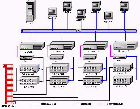 - 系統(tǒng)主要包括二大主機(jī)并由網(wǎng)絡(luò)聯(lián)機(jī)(TCP/IP協(xié)議)作為彼此與遠(yuǎn)程的溝通橋梁。一是錄音接口主機(jī)(VLAN-164)具備模擬輸入音源的匹配接口、音源數(shù)字化、網(wǎng)絡(luò)聯(lián)機(jī)輸出。一是數(shù)據(jù)庫服務(wù)器(DataBase