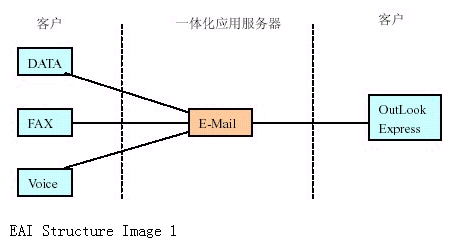 如果我們把各種信息(電話、傳真、數(shù)據(jù))在一體化應用服務器上統(tǒng)一為E-Mail 形式在企業(yè)內(nèi)部或INTERNET 郵件系統(tǒng)轉(zhuǎn)發(fā)。實現(xiàn)起來就較簡單,如下圖所示: