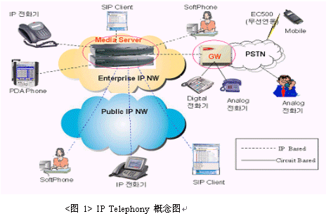IP Telephony是在 VoIP技術(shù) (Voice over IP, 單純壓縮語音傳送技術(shù)) 上的擴(kuò)展, 將企業(yè)內(nèi)部交換機(jī)上實現(xiàn)的各種電話功能與基于IP技術(shù)的通訊應(yīng)用相結(jié)合,提高用戶的業(yè)務(wù)效率。同時不僅支持現(xiàn)有的設(shè)備,包括PBX, 電話機(jī)等還支持基于SIP(Session Initiation Protocol)的終端,提高了電話網(wǎng)的安全性,擴(kuò)展了通訊功能,是一種能兼容所有支持IP技術(shù)終端的通訊平臺。[圖 1]