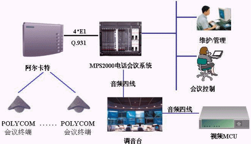 國電中心的音頻電話會議系統(tǒng)采用MPS2000電話會議系統(tǒng)。MPS2000電話會議系統(tǒng)通過4個E1與阿爾卡特的4400交換機(jī)相連,采用Pri信令,用戶通過POLYCOM的會議終端機(jī)參加會議;MPS2000電話會議系統(tǒng)通過音頻四線與調(diào)音臺相連,并通過調(diào)音臺與視頻MCU相連,同時MPS2000電話會議系統(tǒng)通過以太網(wǎng)與其內(nèi)部的局域網(wǎng)相連,同時在局域網(wǎng)內(nèi)設(shè)置一臺維護(hù)終端用于對系統(tǒng)的維護(hù)管理,會議控制臺通過WEB方式對會議進(jìn)行控制。