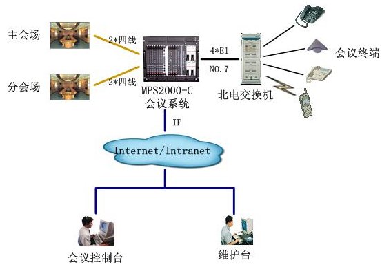 該會議系統(tǒng)通過4個數(shù)字中繼,與北電用戶交換機(jī)互連,采用PRI信令。與視頻會議系統(tǒng)主會場采用四線音頻接口接主會場調(diào)音臺,保證與視頻會議系統(tǒng)音頻的無縫對接。通過以太網(wǎng)口與局域網(wǎng)連接,實現(xiàn)維護(hù)管理及會議控制等功能。