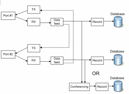 上圖中的媒體和控制數(shù)據(jù)流表示通過Prosody S (HMP) 或Prosody X板卡建立的兩個(或多個)端點之間的呼叫。媒體流(RTP)和信令信息都通過監(jiān)控平臺本身傳輸,高級的應(yīng)用系統(tǒng)會記錄所有SIP/H.323事件和消息。傳真信息也可以存儲,保存在TiFF格式的圖形文件內(nèi)。這里,系統(tǒng)可以在兩端分別錄制RTP流,也可以采用會議的方式錄制在一起。