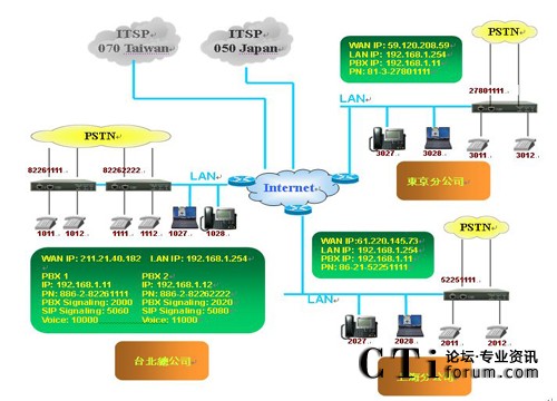 在上圖的架構(gòu)中,各點皆使用MOSA 4604A Plus,皆為2個FXS、2個FXO、4個SIP外線及30個SIP分機的型號,F(xiàn)XO接在當?shù)氐腜STN(公眾交換電信網(wǎng)絡(luò))上,F(xiàn)XS則接在一般的話機上,另各有30的SIP分機可供其它SIP設(shè)備(如SIP