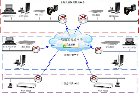 傳輸層:采用網(wǎng)通“寶視通”視頻會(huì)議運(yùn)營(yíng)網(wǎng),該網(wǎng)架構(gòu)在網(wǎng)通IP數(shù)據(jù)骨干網(wǎng)和本地傳輸與接入網(wǎng)之上的業(yè)務(wù)網(wǎng),采用H.264協(xié)議,面向民生行提供可管理的商用視頻會(huì)議網(wǎng)。