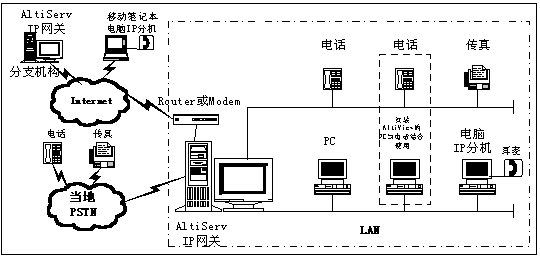 AltiServ系統(tǒng)通過IP組合成一個網絡。同時,該功能允許用戶通過IP外線撥打一個遠端的AltiServ系統(tǒng)