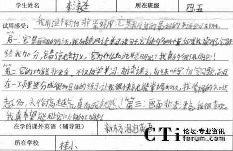 CTI論壇(ctiforum)1月21日消息(記者 潘婷婷):2010年12月,科大訊飛在天津市的兩所小學舉辦了暢言互動英語學生版試用體驗活動,同學們積極參與,在校園內掀起了一股練聽力、學口語的英語學習熱潮。通過實際試用體驗,暢言互動英語學生版學習產(chǎn)品以其強大、實用的學習功能,得到了廣大家長、學校師生的一致認可和充分肯定。