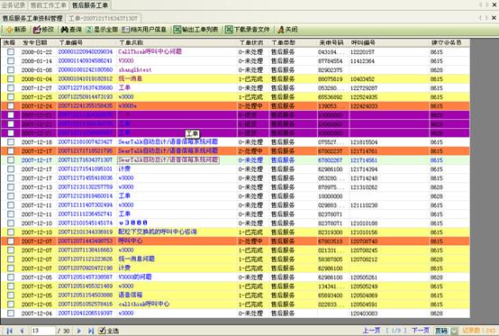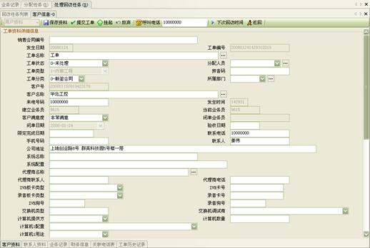 3) 工作流閉環(huán)、客戶(hù)通話歷史,客戶(hù)聯(lián)系歷史,工單流轉(zhuǎn):工作流系統(tǒng)是通過(guò)工單實(shí)現(xiàn)各工作流環(huán)節(jié)的聯(lián)系以及工作流的定義管理,工作流狀態(tài)查詢(xún)、更改的。操作員可根據(jù)用戶(hù)的不同業(yè)務(wù)請(qǐng)求,建立相應(yīng)的工單記錄,并對(duì)該事后處理過(guò)程進(jìn)行跟蹤;也可對(duì)要處理的事務(wù)形成工單轉(zhuǎn)給相應(yīng)的操作員,并跟蹤該工單的處理過(guò)程;可定期提示操作員處理要過(guò)期的工單,以提高服務(wù)質(zhì)量;每次處理過(guò)程都會(huì)有詳細(xì)的記錄,以便統(tǒng)計(jì)查詢(xún) 。如圖8、9、10: