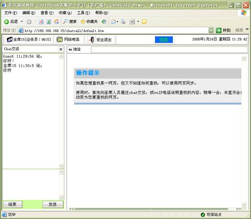 Chart交談:客戶(hù)可以選擇通過(guò)WEB頁(yè)面與座席通過(guò)文字的形式進(jìn)行交談,無(wú)需語(yǔ)音通信 ,客戶(hù)進(jìn)入特定的CHAT網(wǎng)頁(yè)后,可以選擇一個(gè)座席或一組座席進(jìn)行CHAT交談。如圖12和13所示: