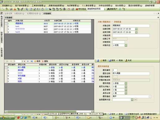外呼中還可以建立問(wèn)卷調(diào)查任務(wù)。同時(shí)還提供題庫(kù)管理、問(wèn)卷編輯等功能,并且題目之間還可以設(shè)計(jì)流轉(zhuǎn)順序。方便使用者靈活設(shè)定問(wèn)卷內(nèi)容。如圖20、21所示: