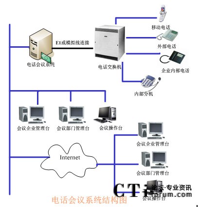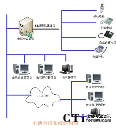 TalenTel CNF電話會議系統(tǒng)可以與程控交換機配合使用,也可以直接與局方的系統(tǒng)進(jìn)行連接,系統(tǒng)的構(gòu)成含如下幾部分:TalenTel CNF電話會議系統(tǒng)服務(wù)器(ctsIVR)、會議企業(yè)管理員模塊、會議部門管理員模塊、會議操作員管理模塊、數(shù)據(jù)庫等組成。