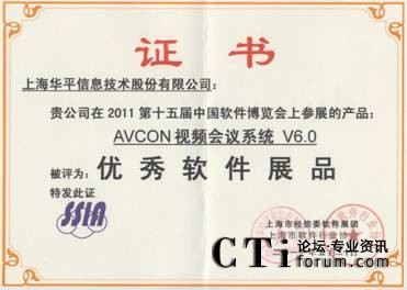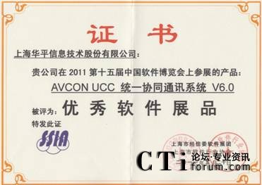 CTI論壇(ctiforum)6月1日消息(記者 潘婷婷): 近日,由工業(yè)和信息化部、國家發(fā)展和改革委員會、科學(xué)技術(shù)部、國家外國專家局和北京市人民政府共同主辦,中國軟件行業(yè)協(xié)會、中國電子信息產(chǎn)業(yè)發(fā)展研究院等單位承辦的第十五屆中國國際軟件博覽會參評軟件產(chǎn)品評獎揭曉,經(jīng)過專家組的嚴(yán)格評審及在技術(shù)領(lǐng)先性、應(yīng)用價值等評審指標(biāo)下,由上海市經(jīng)信委軟件展團(tuán)及上海市軟件行業(yè)協(xié)會共同頒發(fā)華平股份優(yōu)秀組織獎,所參展的 “AVCON UCC統(tǒng)一協(xié)同通訊系統(tǒng)V6.0”、“AVCON視頻會議系統(tǒng)V6.0”兩款產(chǎn)品被評為優(yōu)秀軟件展品。