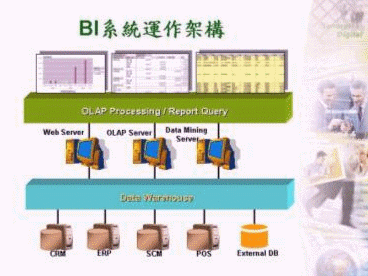 BI(Business Intelligence)即商業(yè)智慧,它是將企業(yè)內(nèi)部各系統(tǒng)(如:CRM、ERP、SCM、POS等)之異質(zhì)數(shù)據(jù)庫(kù)作一匯整,然后再加以整理、分析成有用的信息,以提供決策者作為企業(yè)經(jīng)營(yíng)管理之參考。
