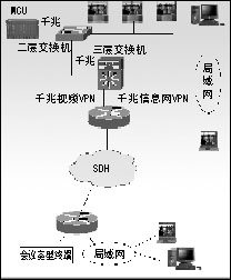 綜合業(yè)務數(shù)據(jù)網(wǎng)上的信息網(wǎng)VPN,連接省公司和各市公司的局域網(wǎng),桌面終端分布于省市兩級的局域網(wǎng)上。MCU通過三層交換方式接入省公司的信息網(wǎng),實現(xiàn)各個桌面會議終端的接入。在信息網(wǎng)上,要設置路由的QoS,實現(xiàn)桌面視音頻業(yè)務的優(yōu)先傳送。