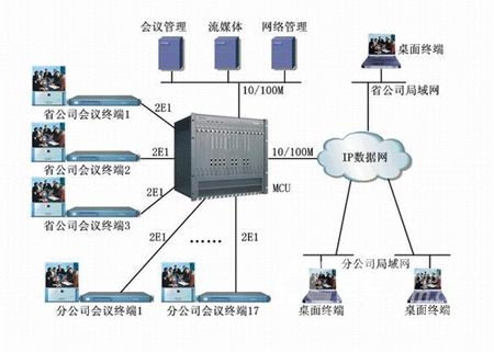 該系統(tǒng)基于蘇州科達(dá)公司KDV系列視頻會(huì)議產(chǎn)品,全網(wǎng)采用1套MCU、20套會(huì)議室型終端和200多套桌面型終端,其中會(huì)議室型終端通過2條E1線路捆綁與MCU相連、桌面型終端通過10/100M以太網(wǎng)和IP數(shù)據(jù)網(wǎng)與MCU相連。總體網(wǎng)絡(luò)結(jié)構(gòu)如下圖所示: