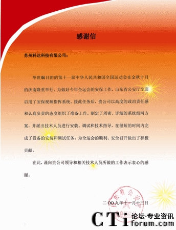 CTI論壇(ctiforum)12月29日消息(記者 張塵):日前 ,山東省公安廳向蘇州科達(dá)科技有限公司發(fā)來感謝信,對(duì)蘇州科達(dá)為保障全運(yùn)會(huì)順利、安全召開所做的貢獻(xiàn)表示衷心的感謝。