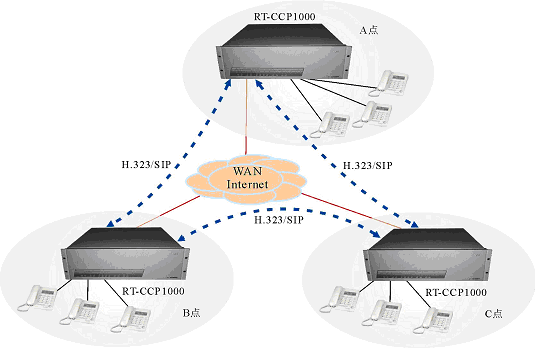 - 多個(gè)位于不同地點(diǎn)的RT-CCP1000通過廣域IP網(wǎng)互連,組成一個(gè)統(tǒng)一系統(tǒng),實(shí)現(xiàn)遠(yuǎn)程無縫通信。
