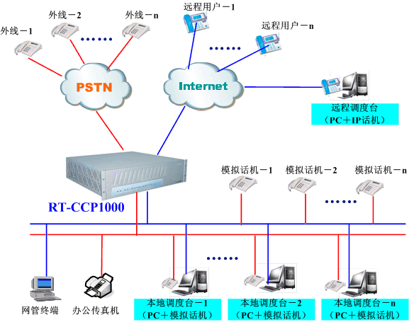 融天科技一體化IP調(diào)度指揮系統(tǒng)RT-CCP1000充分融入了先進(jìn)的VOIP技術(shù),支持遠(yuǎn)程IP用戶接入/遠(yuǎn)程調(diào)度模式,該調(diào)度系統(tǒng)可廣泛地適用于部隊、鐵路、水力、電力、航空、礦山、石油、冶金、化工等企業(yè)與單位,系統(tǒng)組網(wǎng)圖大致如下:
