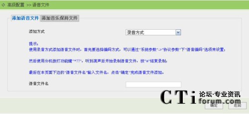 選擇錄音方式添加語音文件時,使用分機(jī)撥打電話錄制語音文件功能鍵“*77”,聽到滴聲后開始錄制,按“#”號結(jié)束錄制。然后通過“高級配置”->“語音文件”,點(diǎn)擊“添加”鏈接按鈕進(jìn)入添加語音文件頁面,選擇添加方式為錄音方式,在語音文件名處為剛剛電話錄制的音文件,添加一個文件名后,點(diǎn)擊“確定”完成語音文件添加,如下圖所示: