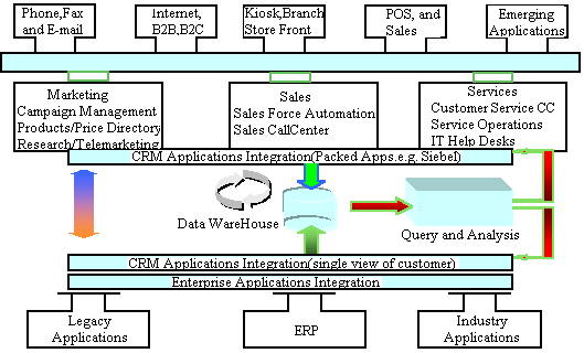 傳統(tǒng)的數(shù)據(jù)庫及中間件軟件廠商,都能提供一些“point solution”(指基于某一單獨技術(shù)領(lǐng)域),例如,單獨的客戶服務CallCenter方案,數(shù)據(jù)倉庫/商業(yè)智能BI解決方案。Compaq向客戶提供的是完整的CRM方案套件,其技術(shù)組成主要包括前端的基于多種接觸媒體(phone,fax,email,web)CallCenter;核心部分的Sales Force Automation,Marketing Automation,Service Operation;以及后端的DataWareHouse/BI,ERP及原有集成應用系統(tǒng)(Legacy Application)的集成等部分。通過下圖我們將詳細描述康柏的整體CRM方案框架及其解決方案: