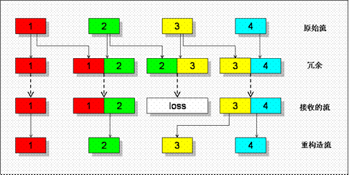 當(dāng)?shù)?個(gè)包在傳輸過(guò)程中丟失時(shí),由于包“3”被冗余編碼到第4個(gè)傳輸包中,在對(duì)端接收到碼流后還可以正常重構(gòu)出包“3”。