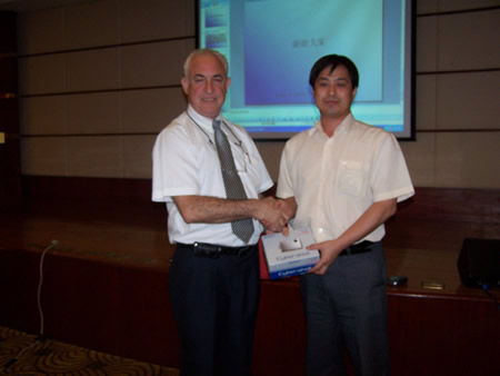 圖為北京站研討會一角及一等獎(T33數(shù)碼相機(jī))中獎?wù)吲cDana先生合影。