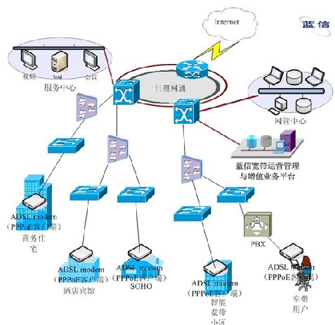 在以以太網(wǎng)技術(shù)為主建設(shè)的運(yùn)營(yíng)區(qū)域,在中心由一臺(tái)模塊化的核心交換機(jī)支持,輔以多臺(tái)BASE設(shè)備連接,在接入層用交換機(jī)做接入設(shè)備,保證用戶數(shù)據(jù)的快速傳播。在網(wǎng)絡(luò)核心處,部署信利公司的藍(lán)信寬帶認(rèn)證計(jì)費(fèi)系統(tǒng),負(fù)責(zé)對(duì)全網(wǎng)用戶的安全認(rèn)證、計(jì)費(fèi)及管理。藍(lán)信寬帶認(rèn)證計(jì)費(fèi)系統(tǒng)除支持標(biāo)準(zhǔn)的RADIUS協(xié)議外,還支持PPPoE、802.1x認(rèn)證。在用戶終端處,部署藍(lán)信特制的PPPoE客戶端,實(shí)現(xiàn)撥號(hào)上網(wǎng)。