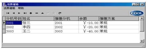 催繳調(diào)度表中的%欠費(fèi)%,用戶可以從計費(fèi)系統(tǒng)的月報表中提出(用戶輸入月份,自動根據(jù)催繳電話取過來);也可由用戶再次修改(針對所欠不是一個月的費(fèi)用),但“刷新”又從從計費(fèi)系統(tǒng)的月報表中更新數(shù)據(jù)。