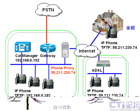 PCS的PhoneProxy是一套軟件,只要在中心CallManager站點(diǎn)安裝一套PhoneProxy,就能實(shí)現(xiàn)任何能上網(wǎng)的地方,IP電話都能通過廣域網(wǎng)注冊,不需要任何VPN設(shè)備。