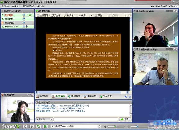 CTI論壇(ctiforum)05月19日消息: 自08年攜手視維Super-V視頻會議以來,中石油雅安分公司銷售部的日常工作會議高效及時地開展,尤其是在5.12四川大地震后,工作不但沒有中斷,而且足不出戶就可以給上級領導匯報工作,與同事交流營銷心得。而在以前,只能通過電話或者郵件,甚至長途跋涉聚集到一個地方舉行會議,既浪費時間又增加營銷成本。這是繼中國重汽、新加坡協美集團等跨國集團公司倡導信息時代新營銷主義,實現高效運營的又一典型案例應用。