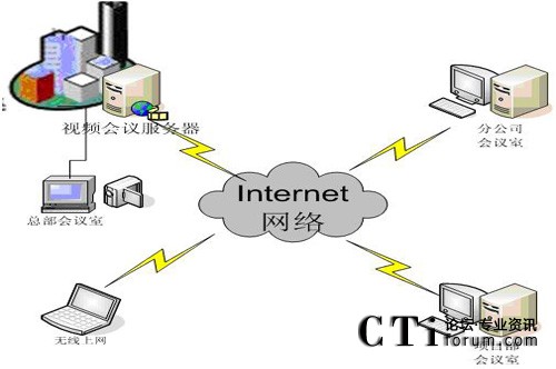 視維根據(jù)互聯(lián)網(wǎng)的網(wǎng)絡現(xiàn)狀和IT硬件資源制定了一套可行的平民化的低帶寬下的高清視頻會議解決方案。以企業(yè)總部為主會場,其他地區(qū)的分公司、各營銷網(wǎng)點和各移動多媒體終端作為分會場,其網(wǎng)絡拓撲圖如下: