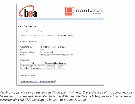 該應(yīng)用是利用BEA WebLogic workshop編寫的,運(yùn)行于 BEA WebLogic SIP 服務(wù)器上。用戶通過BEA WebLogic門戶提供的圖形界面建立會議。BEA WebLogic SIP 服務(wù)器利用SIP協(xié)議與Cantata SnowShore IP Media Server(Cantata SnowShore IP 媒體服務(wù)器)進(jìn)行通信,同時它還使用了MSCML控制媒體處理功能。通過使用XMLBeans, 該應(yīng)用產(chǎn)生并編譯了MSCML。XMLBeans是一個由BEA公司開發(fā)的開源XML綁定工具。 BEA WebLogic Workshop工具使得開發(fā)人員可以很容易地創(chuàng)建這些通過使用SnowShore 媒體服務(wù)器開創(chuàng)的面向Web的SIP和XML接口的融合應(yīng)用。