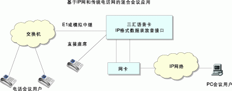 交互式電話會議與傳統(tǒng)的電話會議的區(qū)別就在于開會時不需要由會議主持人控制由某人發(fā)言,而是所有與會者可以自由發(fā)言,就如同坐在同一間會議室中一樣。三匯公司所有型號的基于DSP技術(shù)的語音卡,包括數(shù)字卡和模擬卡,均內(nèi)置了對交互式電話會議的支持,只要使用語音卡,無需額外的會議卡,就可以構(gòu)成具有完善功能的交互式電話會議系統(tǒng)。三匯公司還采用了獨創(chuàng)的分布式電話會議實現(xiàn)技術(shù),電話會議的關(guān)鍵資源----混音器分布在每一個通道中。因此語音卡對會議系統(tǒng)的支持具有極大的靈活性,既可以召開大量的三方會議,也可召開所有通道同時參加的大型會議,無論是會議的數(shù)量還是參加會議的人數(shù)均只受系統(tǒng)總通道數(shù)的限制。三匯語音卡還支持IP會議和傳統(tǒng)電話會議的混合應(yīng)用。