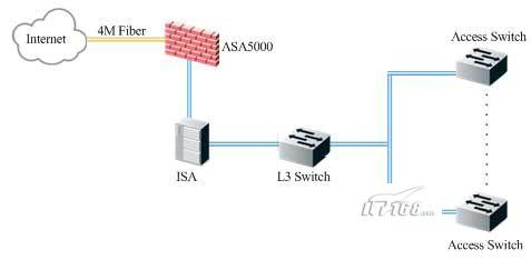 客房局域網(wǎng)通過(guò)一條6M的光纖接入CNC網(wǎng)絡(luò),網(wǎng)關(guān)設(shè)備承擔(dān)了DHCP、NAT和流量限制等功能,同時(shí)在思科6504上安裝有安全板卡,對(duì)內(nèi)部網(wǎng)絡(luò)安全進(jìn)行加強(qiáng)和防御。由于每個(gè)客房有2~3個(gè)信息點(diǎn),客房局域網(wǎng)總共有1300個(gè)左右的信息點(diǎn)。