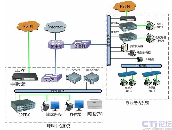 化。在總部核心機(jī)房將電話外線中繼接口與中繼網(wǎng)關(guān)設(shè)備連接,并通過(guò)內(nèi)部網(wǎng)絡(luò)對(duì)接到IPPBX,分別應(yīng)用于辦公電話系統(tǒng)和公司呼叫中心系統(tǒng)。設(shè)備用于公司辦公電話和公司會(huì)議系統(tǒng),可最大支持到30方會(huì)議,或多個(gè)小型獨(dú)立會(huì)議系統(tǒng)。各個(gè)不同的車間可以采用電話線之間接入分機(jī),或采用傲威AVG800的網(wǎng)關(guān)通過(guò)網(wǎng)絡(luò)接入,并注冊(cè)到IPPBX系統(tǒng)實(shí)現(xiàn)內(nèi)網(wǎng)網(wǎng)絡(luò)分機(jī)。對(duì)將來(lái)的分公司的辦公電話系統(tǒng),將不再使用傳統(tǒng)的PBX設(shè)備,而是直接利用IPPBX系統(tǒng),通過(guò)IP