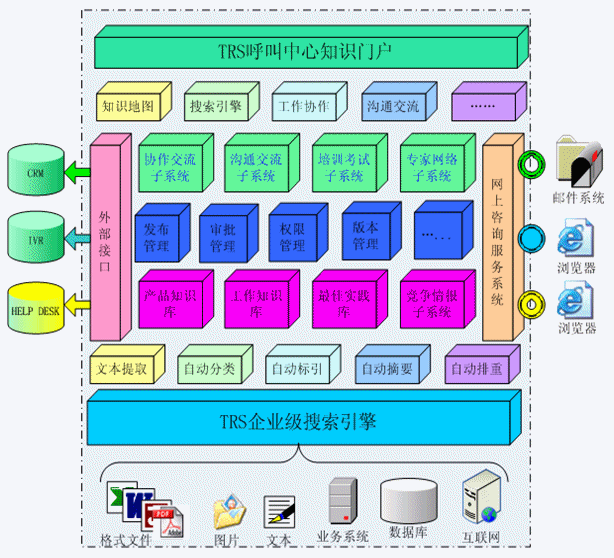 TRS Call Center 知識(shí)管理系統(tǒng)構(gòu)建在TRS企業(yè)級(jí)搜索引擎之上,融合了TRS文本挖掘技術(shù)和內(nèi)容管理技術(shù),全面包括知識(shí)庫(kù)、競(jìng)爭(zhēng)情報(bào)、專家網(wǎng)絡(luò)、培訓(xùn)考試、溝通交流和協(xié)作交流六大子系統(tǒng),以及發(fā)布管理、審批管理、權(quán)限管理、版本控制等系統(tǒng)管理模塊;并集成面向用戶的網(wǎng)上咨詢服務(wù)系統(tǒng),提供面向客戶管理信息系統(tǒng)(CRM)、自動(dòng)語音應(yīng)答系統(tǒng)(IVR)、Help